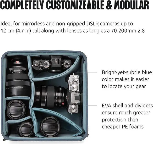 The Medium Mirrorless Core Unit V2 integrates seamlessly with the side access of the Action X30 and X50 backpacks, but it will also fit in every available Shimoda backpack and roller. It includes all the popular features of our Core Unit system, including EVA laminated dividers and sidewalls, a lightweight and versatile removable skin, and an aluminum frame to add extra rigidity and support. The Mirrorless depth is ideal for mirrorless and non-gripped DSLR cameras up to 12 cm ( 4.7 in) tall along with lenses as long as a 70-200mm 2.8.