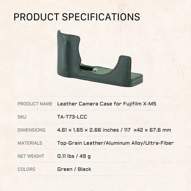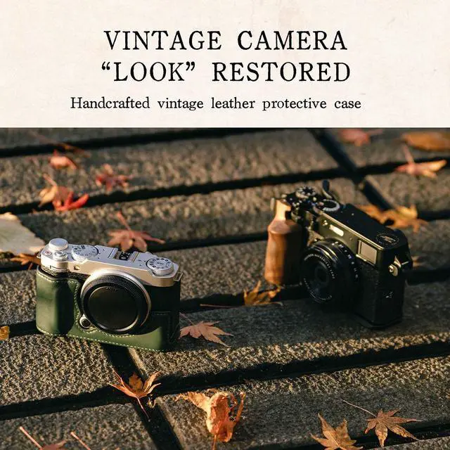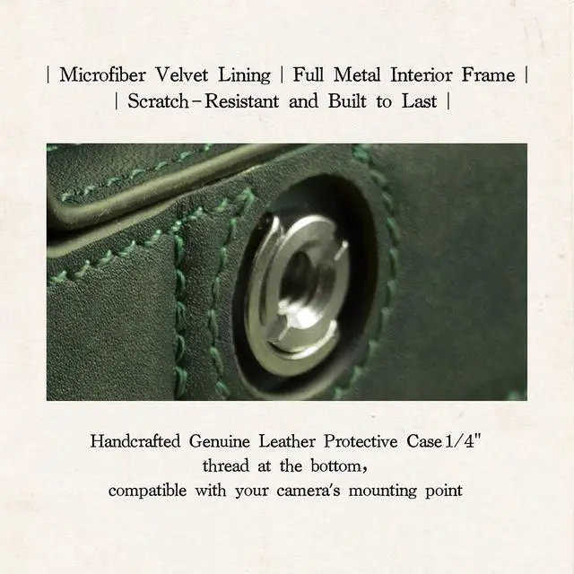 This case mounts via a 1/4"-20 screw and provides a more comfortable way for users to operate and handle the camera body via the integrated hand grip. The design also provides additional protection for the bottom of the camera body, which is especially useful when setting the camera down. A small flap on the bottom provides easy access to the battery compartment. Vintage Camera "Look" RestoredHandcrafted vintage genuine leather protective case. 1/4" thread at the bottom, compatible with your camera's mounting point.