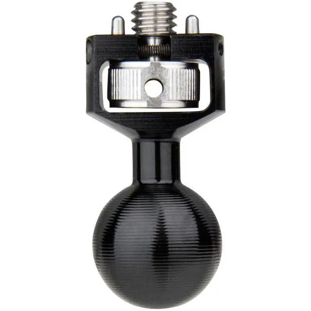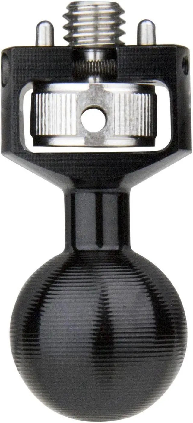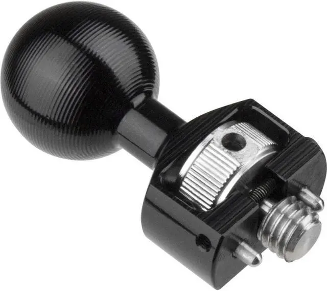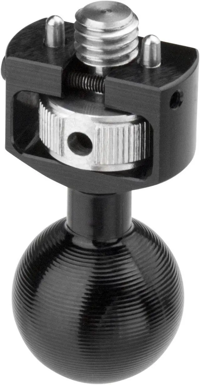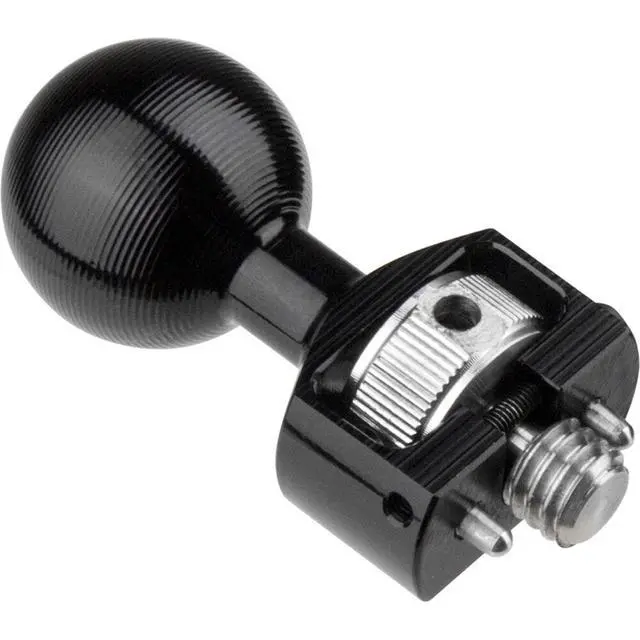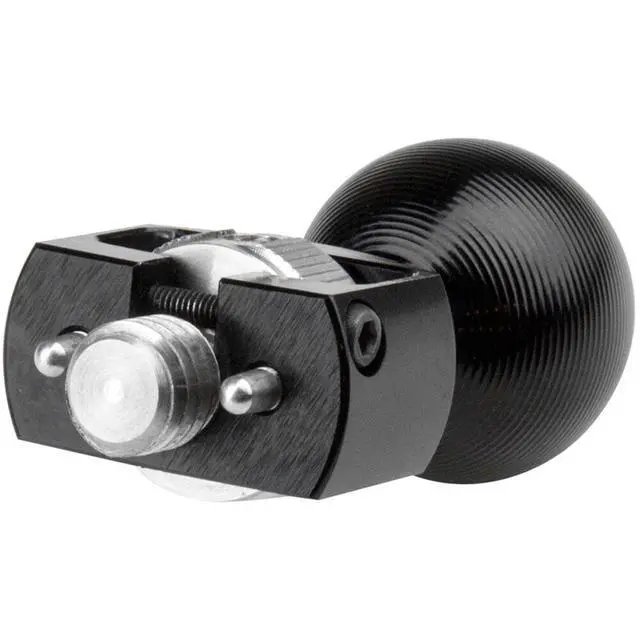Part of the super knuckle system, this CNC machined aluminum ball with 3/8in-16 screw and Arri locating pins prevents equipment from rotating after mounting. This feature is a widely used connection in the video and cinema industries regularly found on camera cages. A knurled tightening knob can be tightened by hand via the thumbscrew, and can provide for easy quick release. A #3 Allen Key can also be used to re-tighten if necessary.
