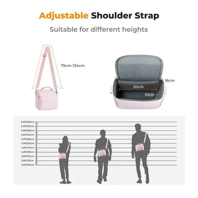 PERFECT SIZE CAMERA BAG: External Size: 9.1 x 7.3 x 5.1 in, Internal Size: 8.3 x 6.8 x 4.3 in, weight only 0.7lb. Length of shoulder strap: 29.5 in - 52.7 in. This sling camera bag has a simple design and is stylish and versatile. Suitable for daily use, outdoor travel, commuting or short trip.