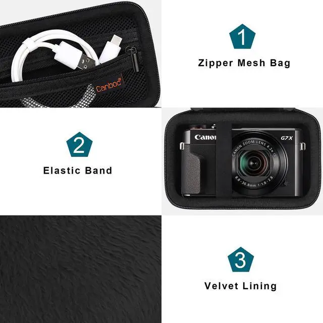 The canon digital camera holder is made of fabric material and high-quality hard EVA, semi-water resistant, shockproof, and not easy to deform. It is also very easy to clean. If there are stains or water droplets on the canon digital camera case, you can wipe it clean with a paper towel. The inner is made of plush cloth. It provides comprehensive protection for the Canon PowerShot G7X Mark II and keeps your PowerShot G5 X Mark II Camera away from the damage caused by dust, scratches and bumps.
