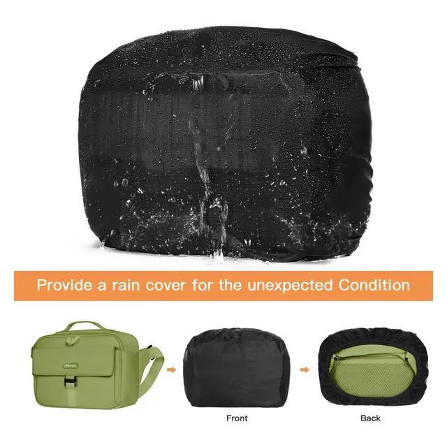 Made with soft polyester material. Waterproof rain cover included can fully protect the whole bag from rainwater, keep your belongs not be wet. Multi pockets for your use. 2 front pockets is designed for you to access some frequent used items conveniently, such as cables, sd cards, powerbank and other small items. And 1 anti-theft zippered pocket on the back for your phone, wallet and other precious items.