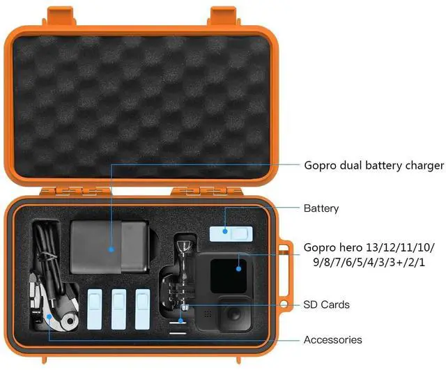 Gopro Hard Case: the hard shell exterior and secure interior cutout protects your gopro hero 13/12/11/10/9/8/7/6/5 camera and accessories from shock, bump, dust,etc