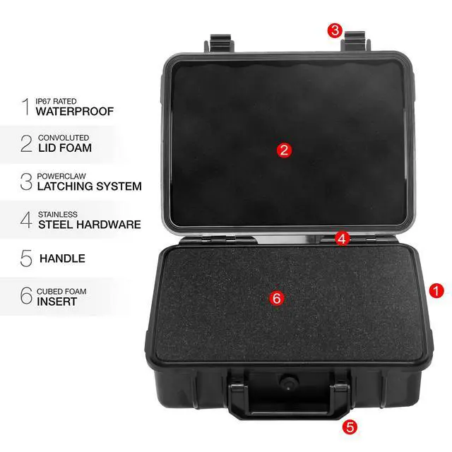 Moocy Protective Cases keeps your valuable equipment safe. Close and latch your Moocy cases to automatically safely seal your gear against water, air and dust. Its tough with foam or dividers will keep your camera, video or high cost equipment safe from impact, providing safe, secure protection from the elements. Built-in padlock holes give extra safety. Moocy optional locking latches give added security and keeps out prying hands.