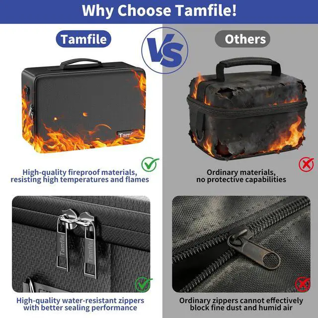 Tamfile camera storage case is made of high-quality fireproof materials—silicone coating and fiberglass—which can withstand high temperatures and flames, providing a certain degree of fire protection and ensuring that the contents are effectively protected in the event of a fire.