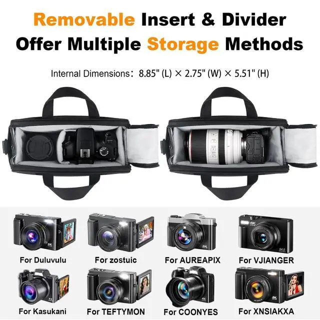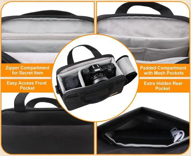 The soft velvet linging and thick padding of this camera crossbody bag can effectively protect 4K digital camera and accessories (Charger, cables, Charging dock, battery, Lens cap or Memory card) from impact, scratches, and other damages.