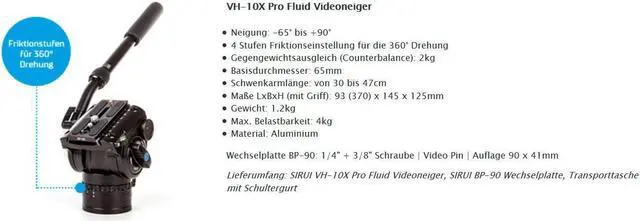 Features: Smooth Fluid movement combined with an advanced balancing system - 360 degrees horizontally and +90 degrees / - 70 degrees vertically. Fully adjustable tilt drag knob. Four-position panning drag including a free rotating zero setting. Precision-machined lightweight aircraft grade aluminum construction. Dual bubble levels for critical alignment. Counter-balance mechanism (2 kg / 4. 4 lb. ). Telescoping handle can be easily positioned on the right or left side of the head. SIRUI's patented safety lock system insures your camera will not slide off the head while adjusting the position of the plate. VP-90 quick release plate included. Padded carry case included.