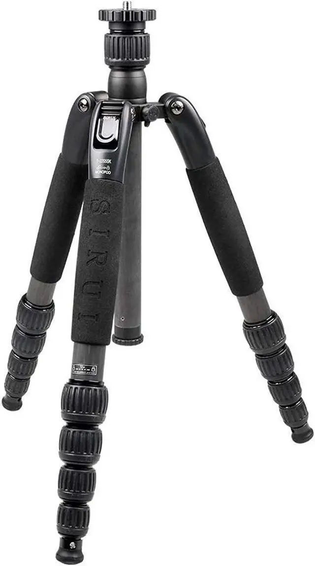 The T-2205SK T-S Series Carbon Fiber Travel Tripod from Sirui is designed for the traveling photographer and features carbon fiber construction to reduce weight to only 3.52 lb while providing a maximum load capacity of 26.4 lb. Magnesium leg sockets further enhance strength while reducing weight and dampening vibration, and the independently adjustable, 3-position legs with the included bubble level help you keep your camera horizontal even when your work surface isn't. As an alternative configuration or for video shooting, the T-2205SK easily converts to a monopod by removing the legs and installing the supplied adapter platform, and when it's finally time to move on to the next location, the T-2205SK folds to just 16.5" and stows conveniently in the included carry bag.