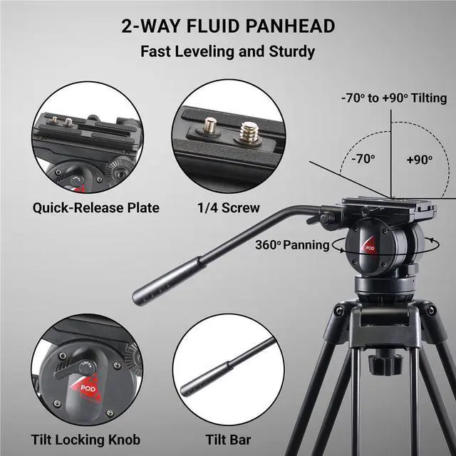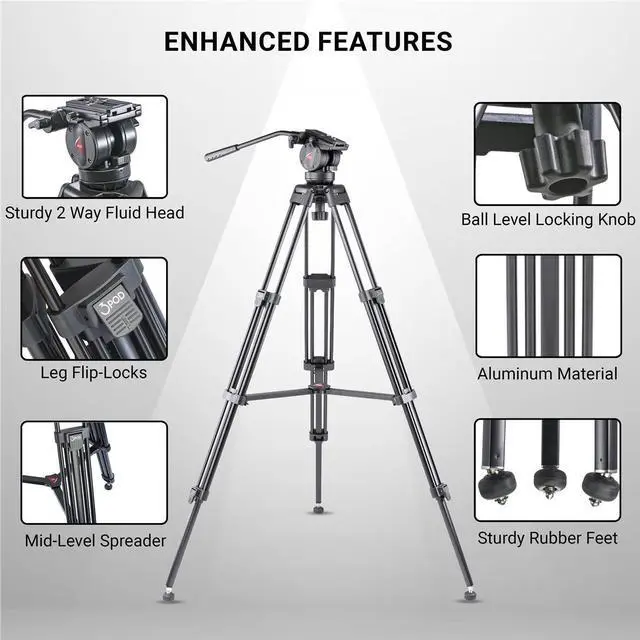 video tripod system, professional heavy duty aluminum twin tube tripod, k2 fluid head, mid-level spreader, max loading 9 lb, dslr camcorder, quick release plateThe 3Pod V3AH is the video tripod of brute strength and stability, boasting an impressive payload of 8.8 lbs. The 3-tiered extendable leg system lets the V3AH reach heights of 61", and features sturdy rubber feet, large, easy to grasp locking knobs, and a torsion resistant aluminum center brace for added strength. The professional 2-Way fluid metal panhead attaches to the tripod body with a half-bowl adaptor mounting system for fast leveling and sturdy orientation.