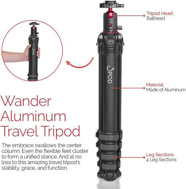 The Wander 4-Section Aluminum Travel Tripod with B2 AB Series Ball Head is a perfect blend of stability, weight, dexterity, and compactness, making it an ideal addition to any photographer's toolkit. This kit features the 3Pod Wander 4-Section Aluminum Travel Tripod and the 3Pod B2 AB Series Aluminum Travel Ball Head with Arca-Type Quick Release, offering a lightweight and travel-friendly camera support system. The 3Pod Wander is designed for easy transport and quick setup, with a compact "Negative-Space" design that makes it as portable as a 1-liter water bottle. Its three sleek telescopic legs slide smoothly into position, providing a firm and stable support for your camera.