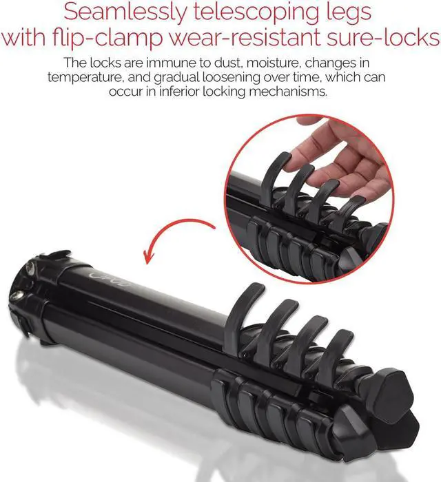 After use, the tripod folds neatly into a compact size, showcasing its efficient zero space waste design. This travel-friendly aluminum camera support is not only functional but also aesthetically pleasing with its anodized red accents and superior wear-resistant finish. Despite its lightweight construction, it can support heavy-duty photography projects with a payload of up to 17.6 pounds. The center column can be extended to give the system a total height of 70" without sacrificing stability, and a retractable weight hook provides an additional counterbalance for hanging accessories. Each 4-sectioned telescoping leg features three-position auto-settings and can lock individually at preset angles, making it perfect for uneven terrain.