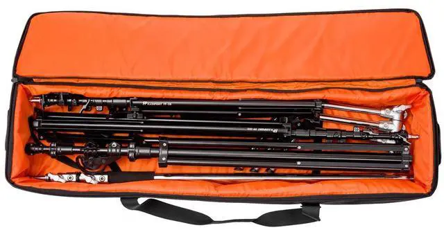 The Slinger BigBag Heavy Duty Lightstand Bag with Wheels is specifically designed to safely and comfortably transport all your stands and umbrellas. It can even fit Century stands! (A. K. A. C+ Stands) This case has roller-bearing softrubber wheels, is fully padded on the inside with adjustable straps to prevent shifting, and has a durable outer shell with triple-stitched seams and weatherproof sealing.