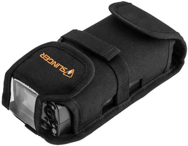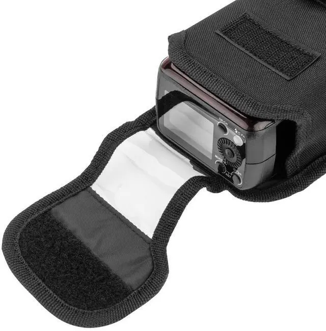 Designed with practicality in mind, the pouch allows the eVOLV to hang from a stand or rest on the shoulder, while keeping the cable end unobstructed. The clear top window ensures the LCD panel on the flash remains visible, and the controls are easily accessible, even when the body is securely fastened with the multiple Velcro straps and flaps.