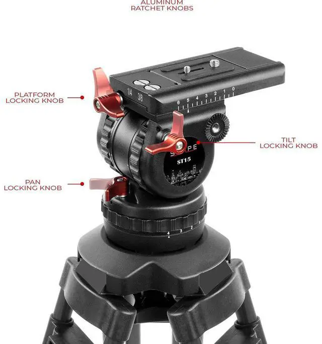The SHAPE Pro Video Tripod's fluid head is precision-made, featuring aluminum ratchet knobs that securely lock the head in place for meticulous control over pans and tilts. The camera plate is designed with a 2.36" (60mm) travel range, facilitating effortless balancing of your camera on the head. With 12 steps divided into two gears for tilt adjustments and 4 steps on one gear for pan movements, you have the granularity needed for precise framing and smooth motion. Experience the full range of motion with a tilt range of +90°/-70° and a complete 360° pan capability, allowing for limitless creative possibilities.