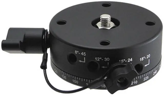 For 360 x 180deg. Spherical & HDR Panoramas With precision CNC machined components, laser engraved markings and lubricated bearings for smooth rotation, allow full spherical panoramas to be quickly and accurately captured. 64mm Diameter/Nadir Footprint Diameter of 64 mm provides sufficient precision and stability while keeping the nadir footprint small. 4x Detent Interval Options Four different degree stop increments: 20, 12, 8 & 4 stops (18, 30, 45 & 90deg. ). The detent interval (click stop) option can also be changed in seconds, with a knob for locking rotation.