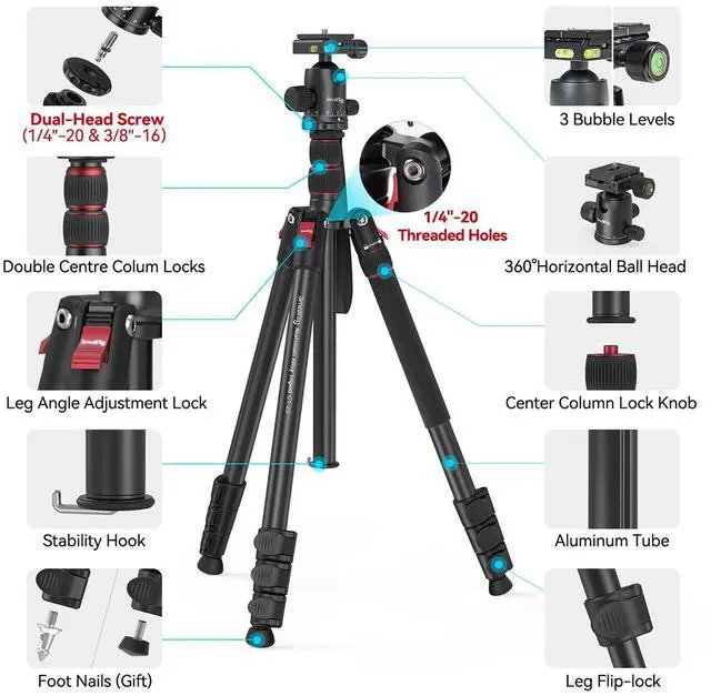 The central pole can be inverted for low-angle shooting and macro photography, further expanding your creative possibilities. The CT-20 features a 36mm 360-degree detachable ball head, larger than many competitors, providing superior stability and smooth movement for precise framing. This ball head allows you to capture shots at any angle, horizontally or vertically, ensuring you never miss the perfect shot. In addition, the tripod's ball head is detachable, thanks to the double-headed screw design on top of the tripod. This makes the CT-20 compatible with both 1/4"-20 and threaded holes ball head or fluid head, offering you even more versatility.