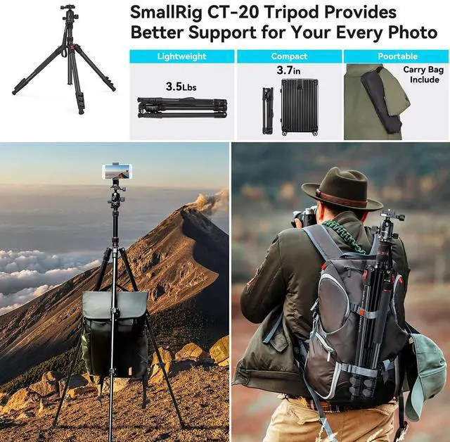 Uniquely, this tripod also includes three 1/4" threaded holes on the bracket, accommodating external magic arms, mobile phones, monitors, and more. This feature sets the CT-20 apart from other tripods, making it a truly versatile tool for all your photography and videography needs. Despite its robust capabilities, the CT-20 remains portable with a folded size of 19.6", and a weight of just 3.46 lbs. It comes with a carry bag, allowing you to easily transport it to any location. With the CT-20 4-Section Aluminum Tripod/Monopod with Ball Head, you can focus on capturing the perfect shot, without worrying about stability or versatility.
