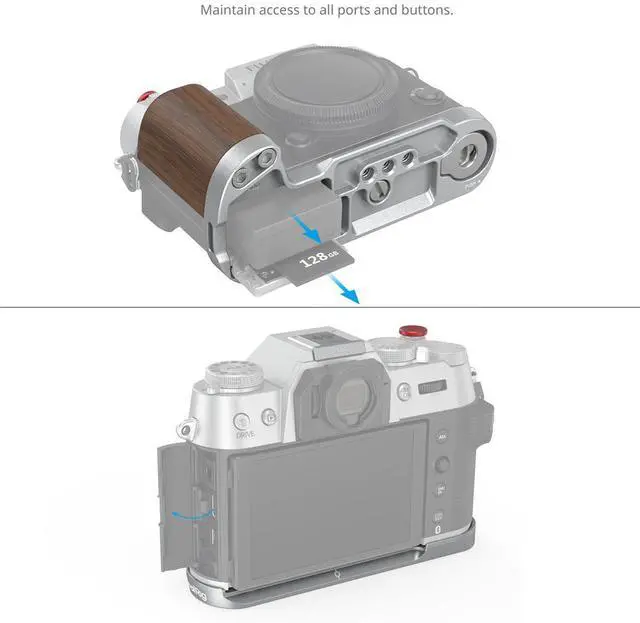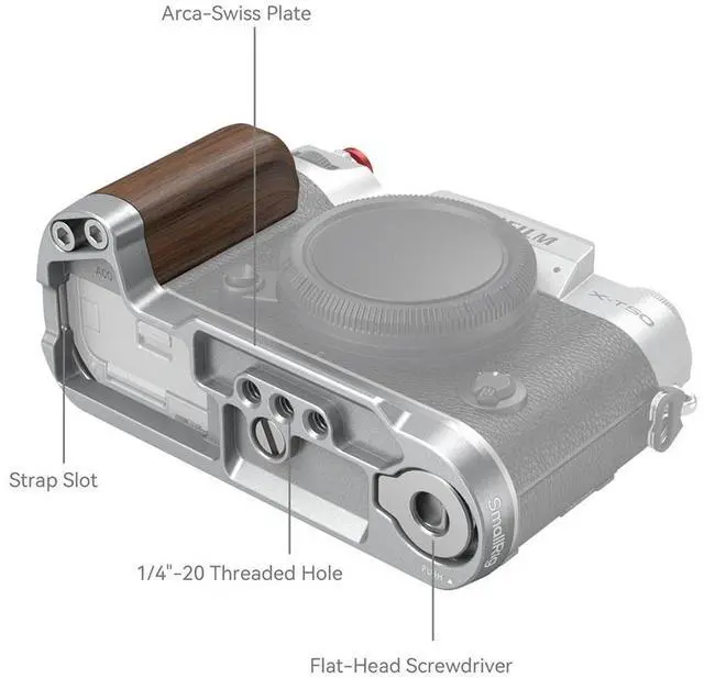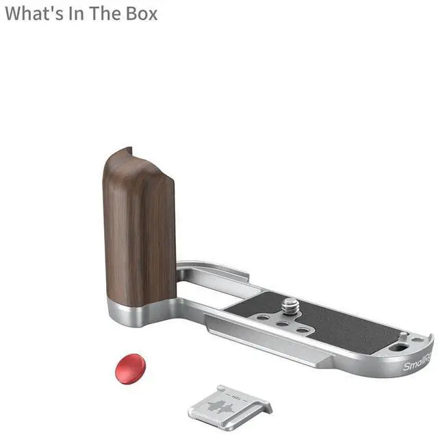 Wrist Strap (ID: 3848), offering additional security and convenience. The integrated flat wrench on the bottom simplifies the assembly and disassembly of accessories, enhancing your shooting efficiency. As a tribute to FUJIFILM, the grip comes with an exclusive hot shoe cover, adorned with the "FUJIFILM" sound wave and the year of the company's foundation. Additionally, it features a shutter release button designed for a soft and comfortable finger touch, ensuring smooth operation. The SmallRig Wooden L-Shape Grip combines sophisticated grip enhancement with the elegance of a wooden handgrip, making it an ideal accessory for photographers seeking both functionality and style. For added comfort, it includes a PU shoulder strap, allowing you to carry your camera with ease during long shoots.