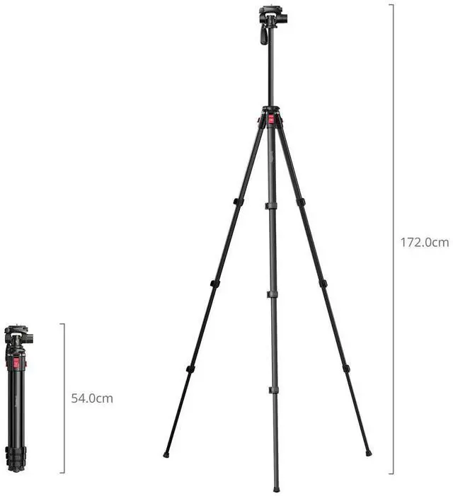 SmallRig Video Tripod 5474 is expertly crafted for photography, videography, and live streaming. It features a 1/4"-20 screw at the top for camera mounting and accessory expansion, along with a 3/8"-16 screw at the base for compatibility with a variety of photography equipment. With an adjustable center column that extends to a working height of 172cm ( 67.7 in), this tripod meets diverse shooting requirements. When it's time to pack up, it collapses to a compact 54cm ( 21.2 in) for easy transport, weighing just 1155g ( 40.7 oz) - making it the perfect companion for on-the-go shooting.