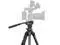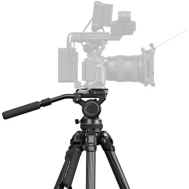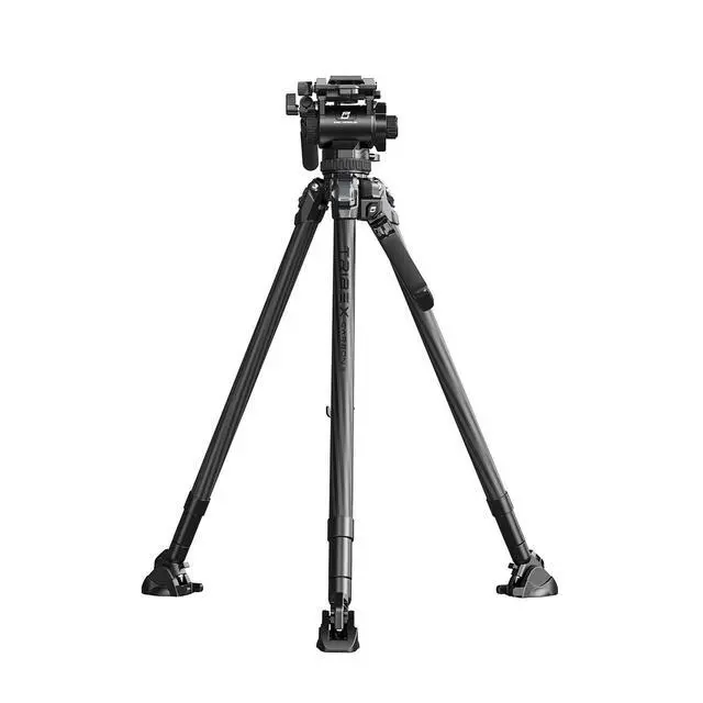 The fluid head also features three 1/4"-20 threaded holes for attaching accessories like magic arms, along with a built-in flat head screw for convenient camera installation and removal. The tripod also includes quick-release rubber feet with integrated spikes, allowing for seamless adaptation to various terrains.