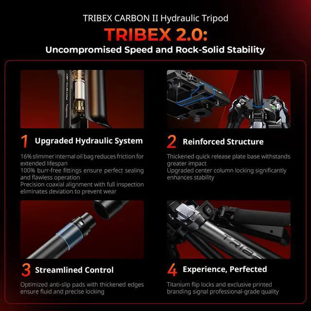 SmallRig x Potato Jet TRIBEX Carbon II Tripod Kit 5755 is designed for professional outdoor videography, offering swift and convenient operation. Featuring X-Clutch hydraulic technology, squeezing a single clutch allows all legs to rapidly unfold, adjust the angle, and automatically lock in just one second, providing photographers with a seamless experience. The clutch can also be adjusted to 45 Degree and 90 Degree to accommodate various shooting scenarios. Constructed with carbon fiber, both the legs and center column ensure lightweight design while delivering exceptional stability and high load-bearing capacity. Operating altitude ranges from 27cm ( 10.6 in) to 168cm ( 66.1 in), and a compact storage length of 79cm ( 31.1 in).