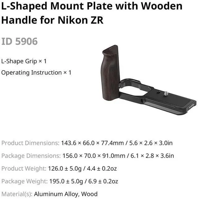 SmallRig L-Shaped Mount Plate with Wooden Handle for Nikon ZR 5906 is designed to enhance grip comfort and protect the camera base. It integrates seamlessly with the camera body for a secure fit and unified aesthetic while effectively guarding the base against impacts. The handle combines a retro wooden style with an ergonomic contour for a comfortable grip and premium feel. The base features a built-in Arca-Swiss quick release plate, allowing for direct mounting onto Arca-type tripods (ID 5290, 4222B) and DJI gimbals (RS 2, RSC 2, RS 3 Pro, RS 4 Pro) for rapid transitions between setups.
