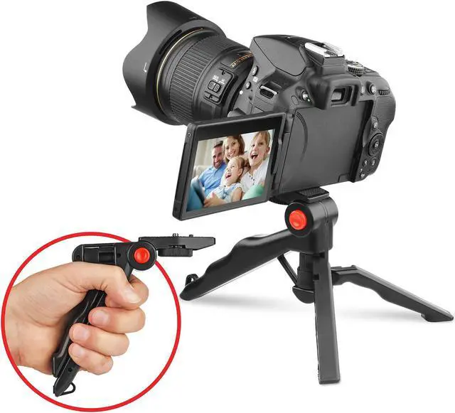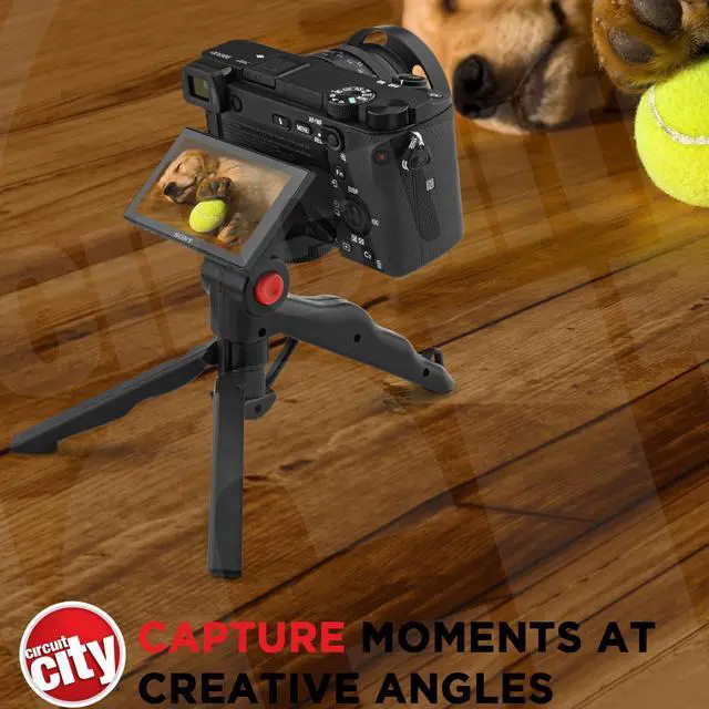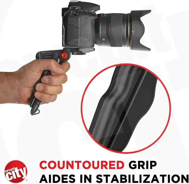 The Circuit City Ultrashot Mini pistol grip table top tripod is the perfect mini tripod for many types of cameras. It doubles as a tabletop tripod and a handheld grip stablizer for a DSLR, mirrorless, point and shoot, or compact camcorder. The legs are rounded on their outer side, so the closed tripod provides a comfortable hand grip. When open, the tripod and head have a maximum height of 4". This low-profile design allows you to take steady shots up close. It has been designed to satisfy the needs of those consumers that are looking for a support that is multifunctional, lightweight, portable and easy to use. It is great for achieving hard to get pictures and video shots while keeping your camera steady. Close the legs to use it as a comfortable pistol grip to capture great videos that stand out from the crowd. The new push-button mechanism enables you to position and lock the 1/4" screw platform in one rapid, intuitive movement. Pushing the button releases the lock so you can adjust your angle. When the button is released, the camera platform is locked automatically in the selected position. The Circuit City pistol grip table top tripod is manufactured from high impact ABS plastic for durability and a tactile finish. With this solid construction, it provides a secure base in every situation and the anti-slip rubber feet guarantee a stable and slip-free stand on any surface.