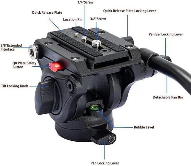 ***** **********Best Quality Guranteed. *****2-Section Pan Bar Detachable handle can be installed on the left or right side according to your needs and the safety lock protects your camera from accidents at all times. *****Made of all-metal precision CNC and casting technologies, the fluid head is firm and stable, rotates smoothly. Its maximum load is 11 lbs/5 kg while net weight is 1.9 lbs/ 0.86 kg only. *****The fluid damping tripod head with the 1/4" and 3/8" screws on the top can be used to mount the camera and telescope. Bottom base diameter 2.36 in/60 mm with 3/8 screw holes Only suitable for 3/8 Female Thread tripods or monopods.