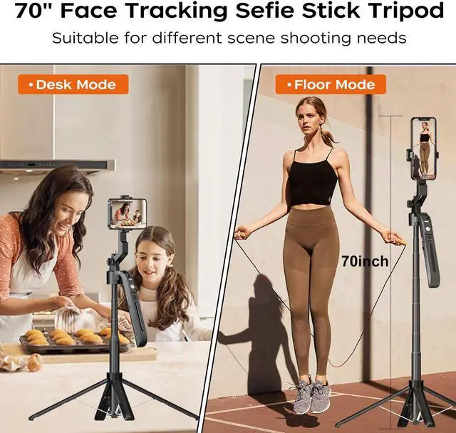 {70 Selfie Stick Tripod & Adjustable Angles } The auto face tracking features 360°phone holder design that supports both horizontal and vertical clamping of mobile phones. Also, Adjustable length from 12.68 to 70.86, free your hands for video recording or live streaming.