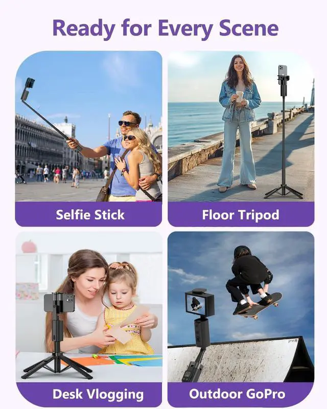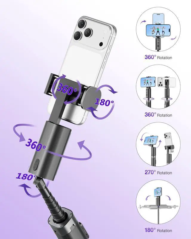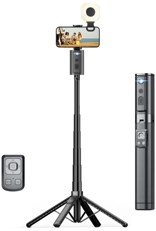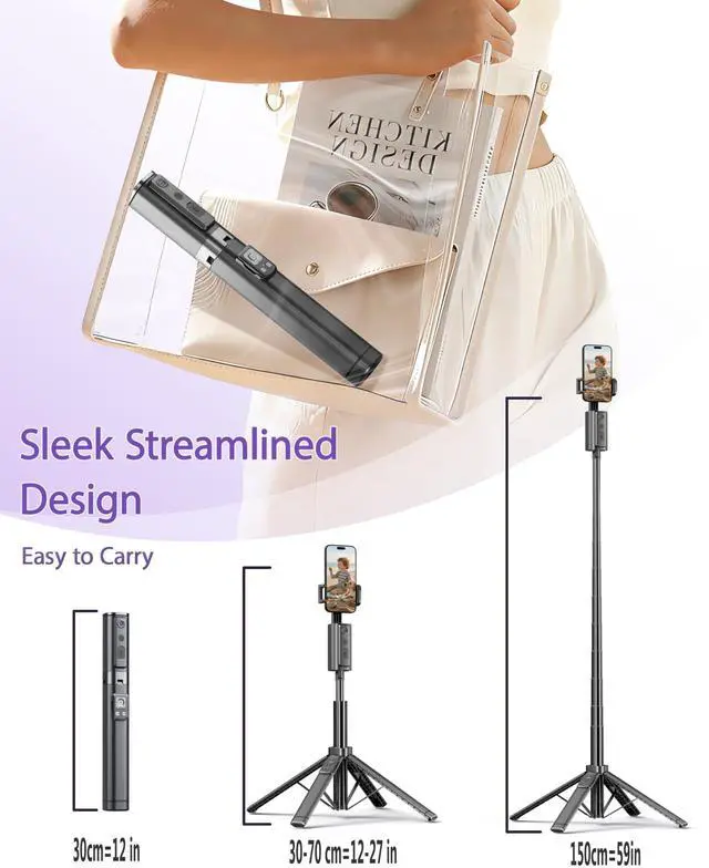 Phone Tripod Stand & Folding DesignThis selfie stick tripod extends up to 59 inches for wide-angle shots, group photos, or high-angle footage, and collapses to just 11.8 inches with sleek, seamless lines and a streamlined ergonomic design.The smooth body features no loose joints, blending modern aesthetics with portability it easily put into backpacks or travel bags, making it a portable phone stand for on-the-go content creators and outdoor shooting.
