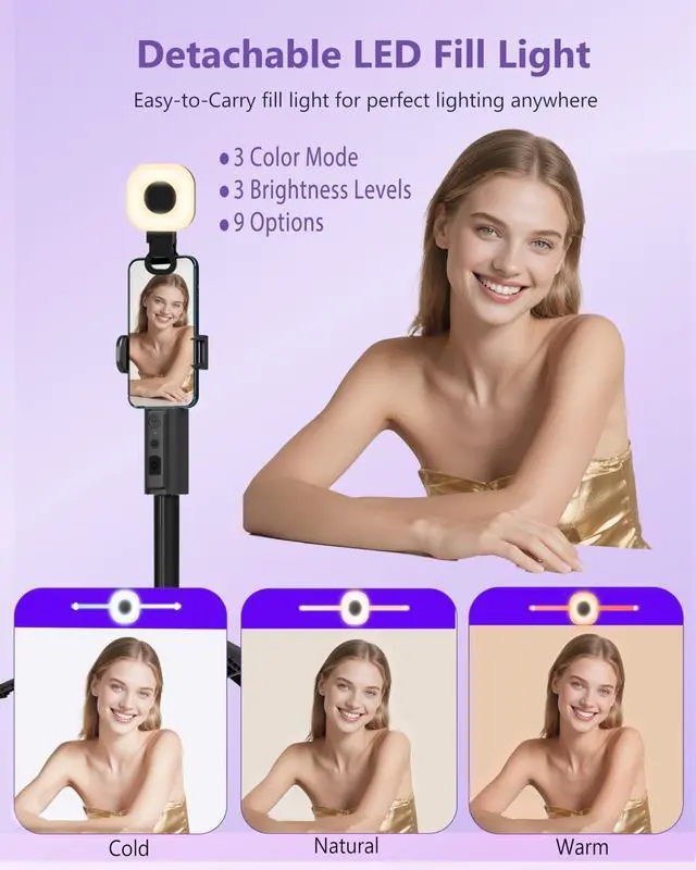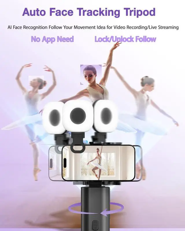Detachable Fill Light for IOS&AndroidThis motion-tracking tripod comes with a removable square fill light, featuring 3 adjustable color temperatures (warm, cool, natural) and 3 brightness levels per mode. It enhances video/photo quality in low-light conditions, reducing shadows and boosting clarity, perfect for night shoots, indoor live streams, or dimly lit environments.