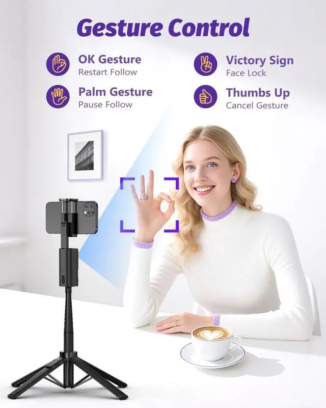 Auto Tracking Tripod StandThis phone tripod for content creators is equipped with real-time AI computing system no app download required. It intelligently recognizes and follows your face or body movements, providing 360° full-range tracking and rotation to keep you centered in the frame. Built-in advanced gesture recognition: [OK]" to start tracking, "[PALM]" to pause, "[V]" to lock on the face, "[Thumb up]" to stop gesture control enabling hands-free operation.