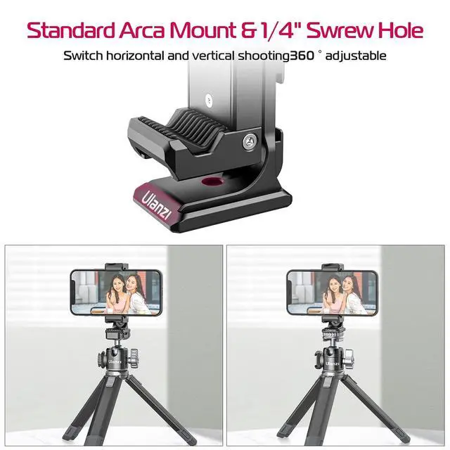 Standard Arca Mount BaseThe ULANZI phone holder for tripod includes a standard Arca-type quick release plate for fast setup. It also has a 1/4" screw port at the bottom for connecting to tripods.Built from solid aluminum metal, it's durable and safe