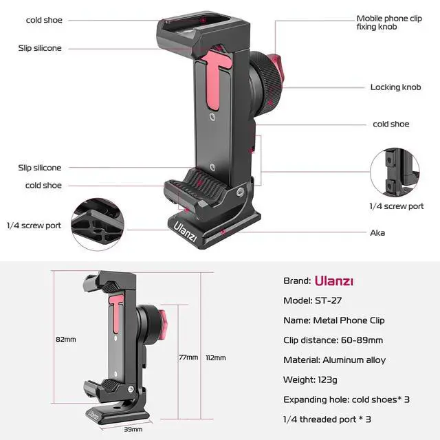 Dual Side Cold Shoe Mounts The ULANZI ST-27 smartphone tripod mount offers two side cold shoes for mounting a fill light and a microphone simultaneously. It's an excellent choice for vlogging