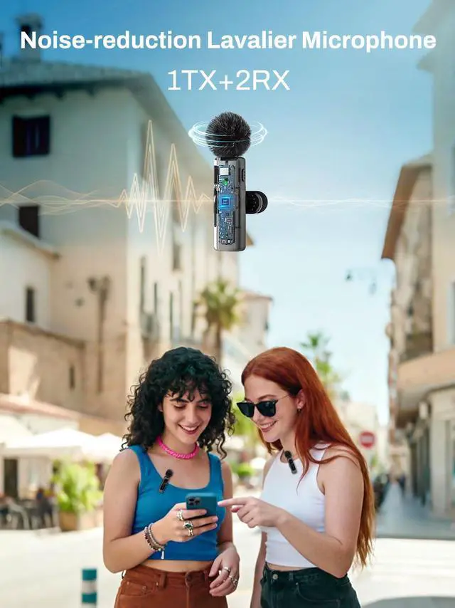 Clear Audio Wireless Microphone2TX + 1 RX) The wireless microphone system helps capture clear voice audio and reduces background noise, with a range of up to 79 feet. Suitable for vlogging, interviews, and recording in various environments.