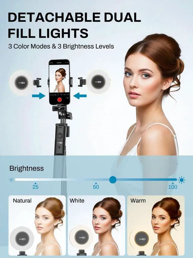 Adjustable Dual LED Fill Lights Two LED light panels with three brightness levels and adjustable color temperatures (cool to warm) offer flexible lighting for indoor setups or low-light conditions, helping you achieve a natural on-camera look.