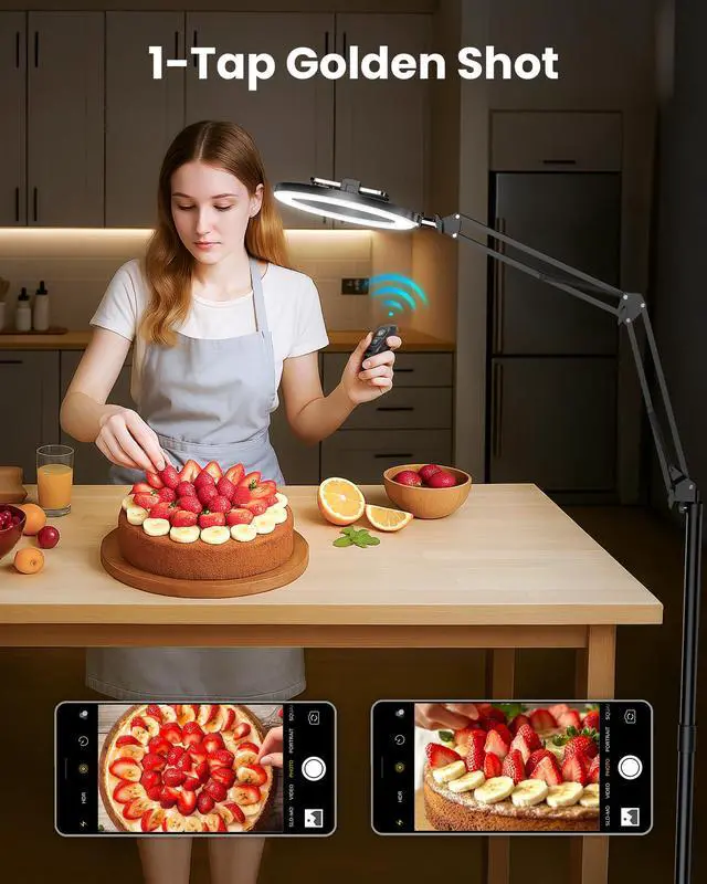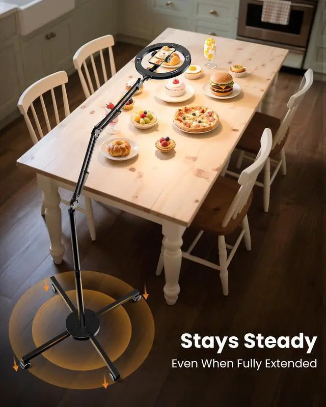 Movable Tripod with BrakeThis high-rise tripod is equipped with three casters and an innovative brake system to ensure stable positioning during shooting. These movable casters will provide you with great convenience when you need to switch shooting scenes or angles. The ring light with stand is designed for multi-angle recording in cooking tutorials/live broadcasts.