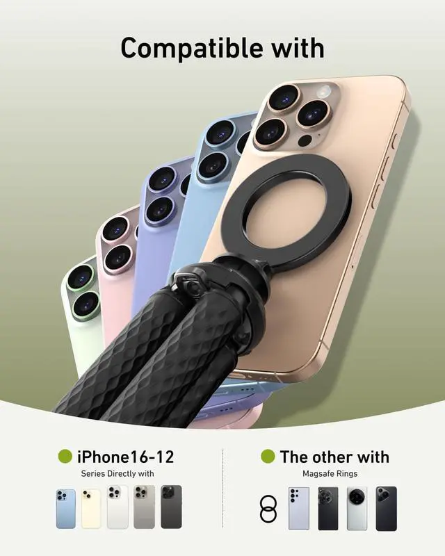 The magnetic ring on the top of this tripod has 16 built-in strong magnetic magnets, so there's no risk of dropping it.