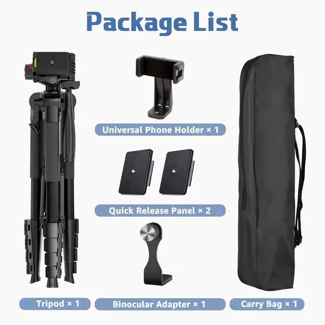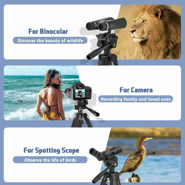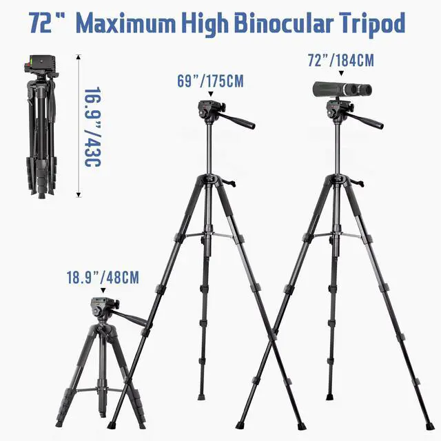 Tripod Height: This tripod is constructed from aluminum and features four flip-lock feet, allowing you to easily adjust the height from 16.9 inches to 69 inches. When used for a binocular or a spotting scope, the shooting height can reach up to 72 inches. For smartphones, it includes a 10cm rotatable phone holder for added convenience. Additionally, its detachable tripod head design reduces the storage height to just 16.9 inches, making it easy to carry. This is the perfect professional binocular tripod.