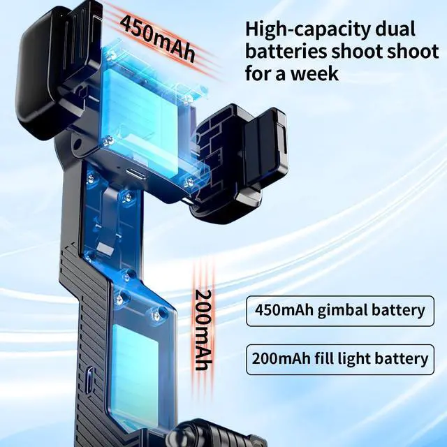Week-Long Power, Non-Stop Shooting:Never fear dead batteries! Dual-battery system: 450mAh handles stabilization, 200mAh powers the fill light. Shoot sunset timelapses, dim concerts, or night streams stay powered through every adventure.
