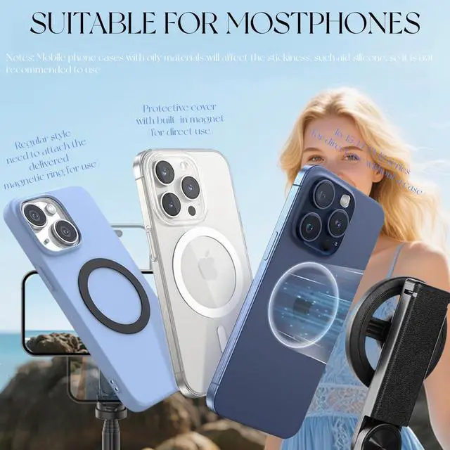Strong Magnetic Attachment, Instant SetupFeatures powerful N52 magnets for seamless compatibility with MagSafe iPhones (12-16 series). Includes a metal ring for all other smartphones, offering secure, clamp-free mounting in seconds.