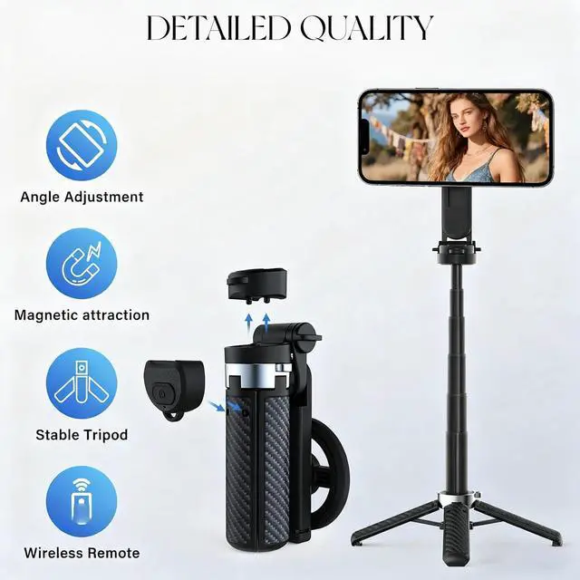 4-in-1 All-in-One MultifunctionCombines a magnetic selfie stick, tripod, 360° phone holder, and Bluetooth remote into one compact toolideal for selfies, vlogging, live streaming, and video calls.