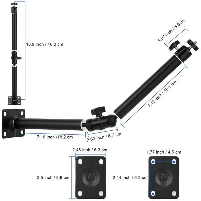 This camera mount arm is aluminum alloy and metal material,sturdy and durable. Twisting joint knob of magic arm ball head adapter to adjust any angle of tube,for tripod ball head be used to adjust angle of camera decive, it is convenient to operate for customers, horizontal maximum load weight is 1.54 lbs / 700g, if you are looking for a flexible camera wall mount to support shooting those key different viewings, it can be installed on the wall, ceiling, wood board, flat smooth metal surfaces.