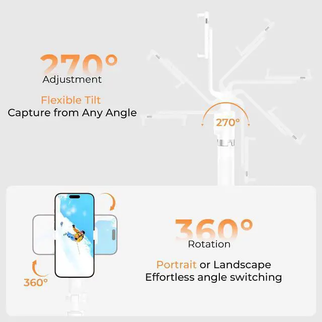 360° Rotating Phone Mount with Insertable Light Mount: This versatile phone clamp ensures smooth 360° rotation for effortless angle adjustments, perfect for photography and videography. The innovative design includes dedicated slots for clip-on LED lights, enhancing low-light shots, portraits, and content creation. A must-have tool for creators who demand flexibility and professional lighting control on the go.