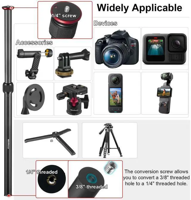 Compatible with tripods, monopods, selfie sticks, and stabilizers to increase their height.