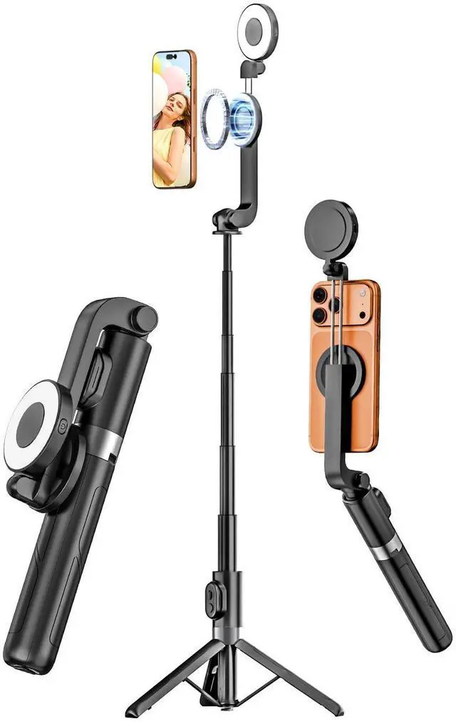 Magnetic Selfie Stick Tripod with Light & Remote, Phone Tripod with Magnetic Holder for Magsafe, 360° Rotatable Cellphone Stand for iPhone/Android for Video Recording, Vlogging(SPT-02)