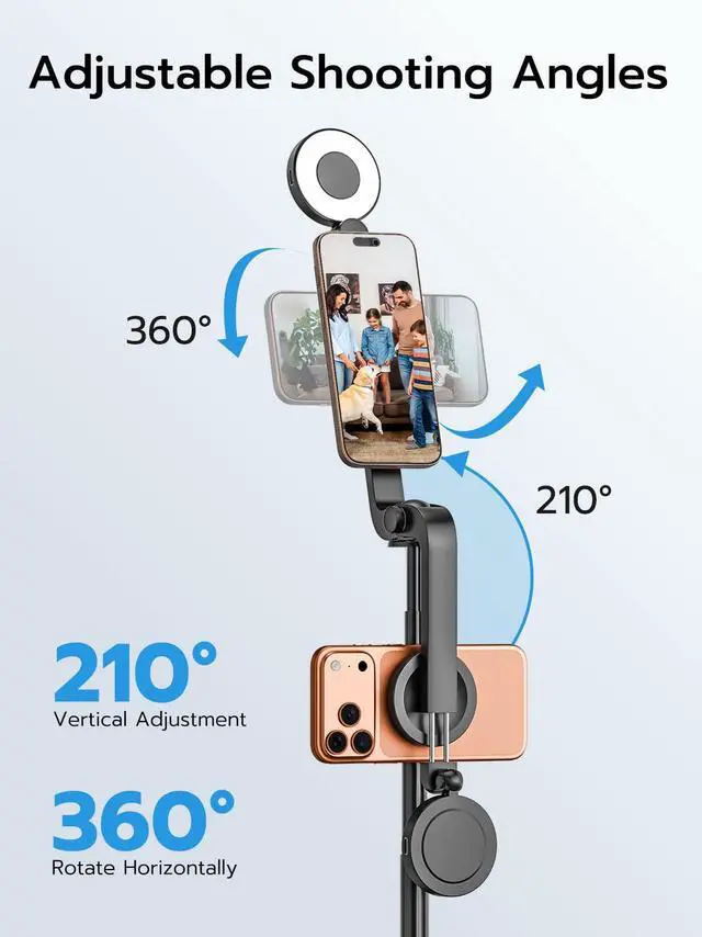 Ring Light with Three-Level Dimming This selfie stick tripod features a built-in ring light that offers three adjustable brightness levels. It effortlessly illuminates dim environments and eliminates facial shadows, ensuring you look bright and clear in night selfies and indoor livestreams.