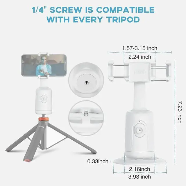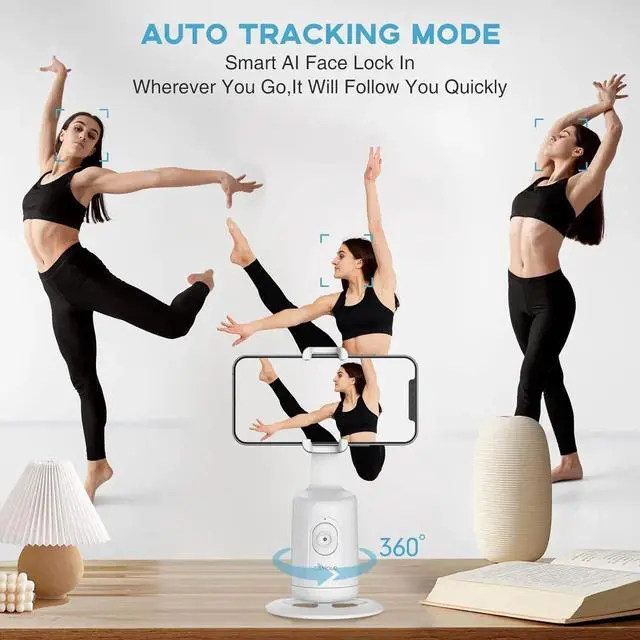 Face Lock In & Smart Shooting: This auto tracking camera stand adopts an artificial intelligence computing system, which can automatically recognize and track your face or body, and automatically rotate stably as you move. Free your hands for video calls and live broadcasts. You can also use our included Bluetooth remote control to connect to your phone. This is very convenient to shoot with the mini remote control.