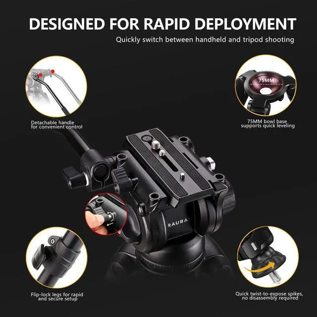 Rapid Adjustment & Terrain Versatility: Features flip-lock legs for quick setup, a 75mm bowl base, and multi-angle adjustments (23°/52°/76°) for fast leveling on uneven ground. Rubber and spike feet adapt seamlessly to any terrain.