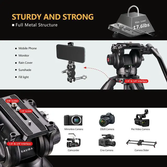 Smooth Operation & Versatile Mounting: Equipped with a fluid drag head for smooth 360° pans and -75° to +90° tilts. Manfrotto-standard quick-release plate with 1/4" and 3/8" screws supports easy switching between handheld and tripod use.